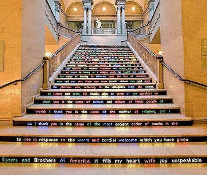 Un pas de plus vers la connaissance et l’amour de Swami Vivekânanda s’est accompli en allant sur les lieux où il a vécu. Parmi ceux que Swâmi Vidyatmananda a visités, celui qui l’a sans doute le plus inspiré fut l’Institut d’art de Chicago, où il aimait se rendre le dimanche après-midi pour se détendre.Nous nous souvenons que dans ce lieu, en 1893, Swami Vivekânanda bouleversait le Parlement mondial des religions par un appel ardent à la fin du fanatisme. Aujourd’hui encore, ses paroles résonnent sur le grand escalier de l’Institut, inscrites à l’occasion de l’anniversaire de Swâmiji en janvier 2026, par l’artiste indien Jitish Kalla, comme un message d’espoir et d’humanité partagée.