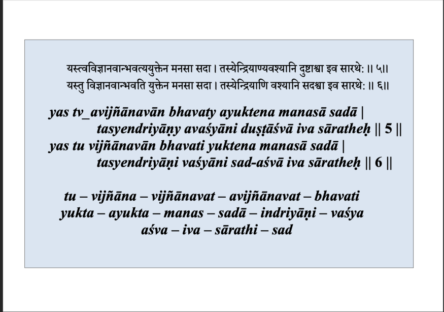 Pour mener à bon port le jīvātman, le char qui est notre véhicule corporel, doit être pourvu de bons chevaux, le mental doit rester concentré pour les piloter, il faut que la buddhi soit animée par vijñāna, la connaissance pure qui donne le discernement.