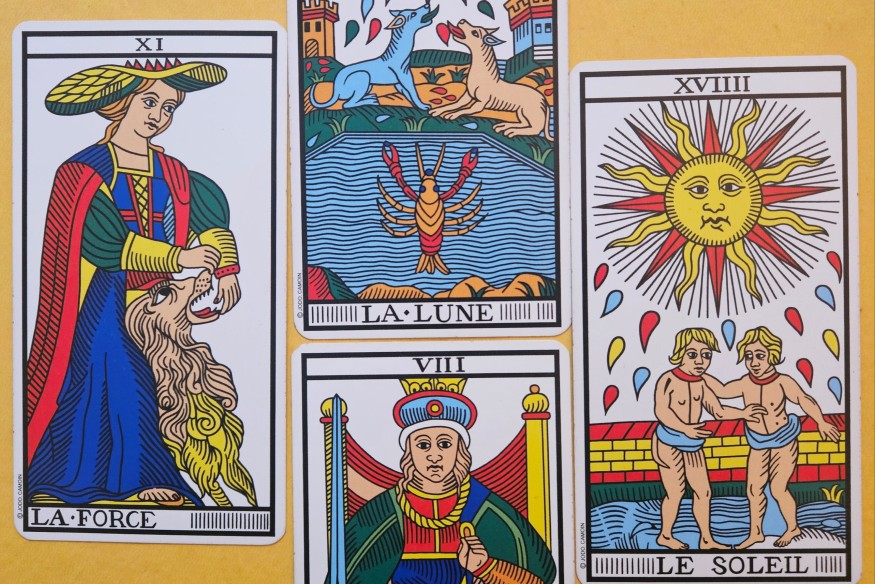 La Lune, La Justice, La Force et Le SoleilNous pouvons vivre un temps de gestation et de patience (la Lune) pour nous accorder à l’équilibre cosmique (la Justice). L’excès de contrôle entrave la fluidité du mouvement (la Force). Restons simples, dans l’évidence de l’énergie de vie qui se déploie (Le Soleil).