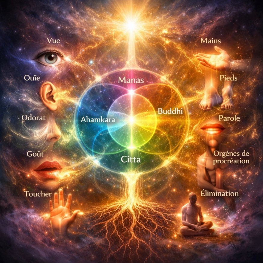 Dans le système du sāṁkhya le mental est présenté comme un organe interne formé de manas, ahaṁkāra et buddhi. Le vedānta ajoute le citta, l’inconscient. Ces quatre aspects du mental sont en lien avec les organes de perception et d’action qui, eux, sont tournés vers l’extérieur. Voyons comment tout cela fonctionne.